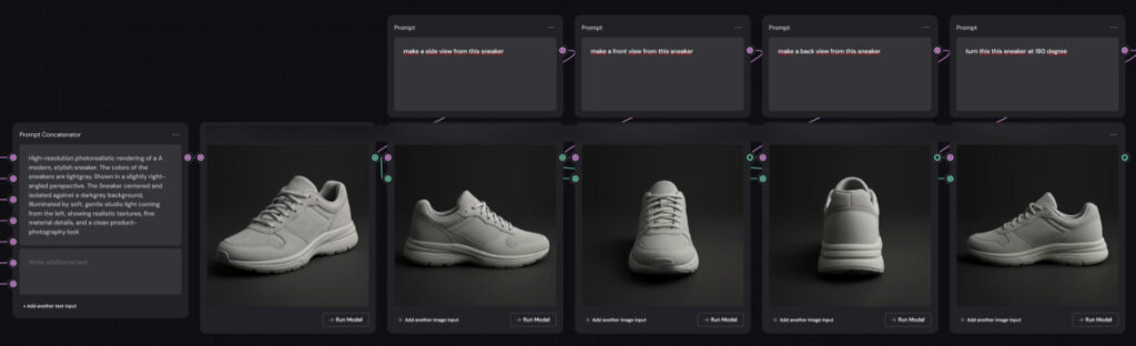 Im nächsten Schritt wird eine passende Perspektive generiert. Danach fügt man Details wie Logo, Nähte oder Materialtexturen hinzu. Aus dieser Basisansicht erzeugt die KI automatisch Front-, Seiten-, Top- und Rückansichten – perfekt für die digitale Produktpräsentation.